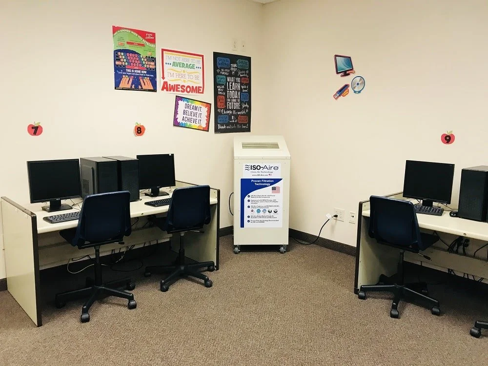 ISO-Aire air purifiers are the best solution for schools, because they require little maintenance and feature large, long-lasting filters. In particular, we recommend the RSF models that address the full range of toxins, particles and viruses. A small classroom under 300 square feet will be well-served by our portable unit which we have two options depending on classroom size. A larger classroom under 1500 square feet will be better-served by the RSF Model.