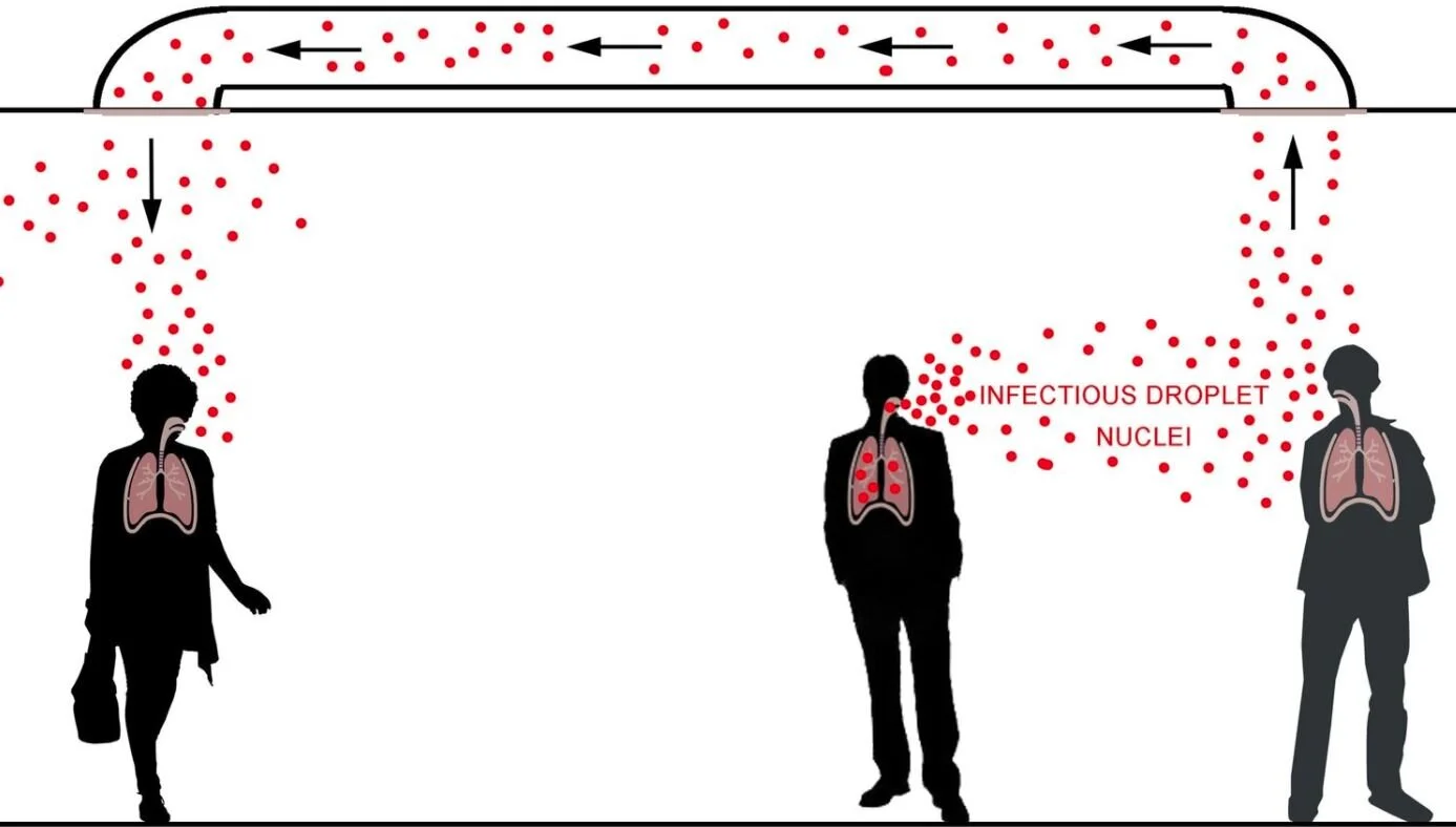Above, aerosolized droplet nuclei are pushed away from the source and pulled into the ISO-Aire HEPA filtration unit where they are captured and destroyed with a combination of medical-grade HEPA filtration, UVC sanitization and/or ozone-free bipolar ionization components.