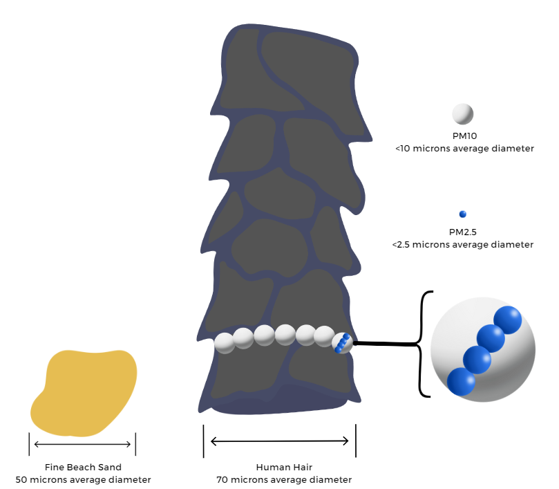 Particulate size comparison with beach sand, human hair, PM10, and PM2.5 particulates.